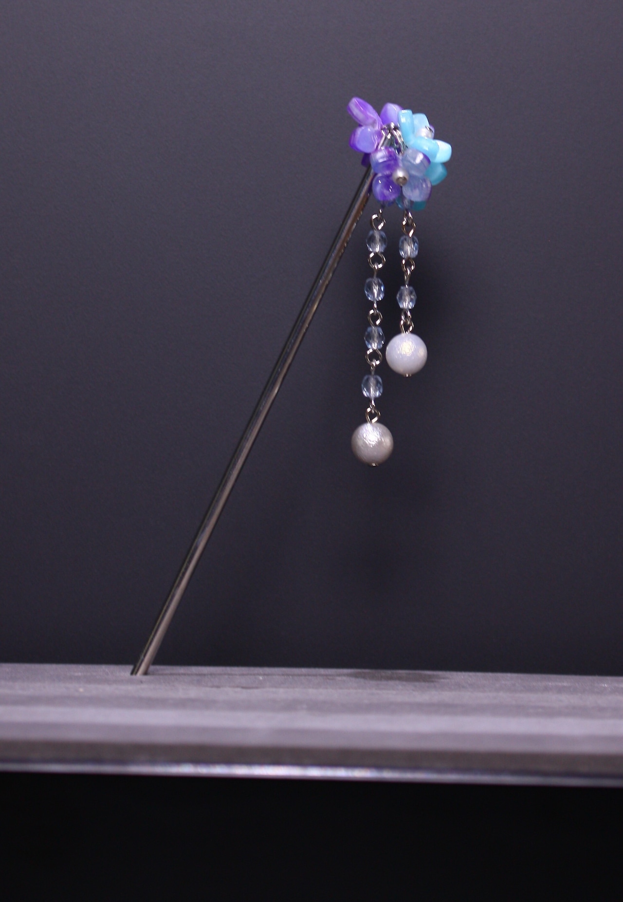お花やアクリルビーズを使用して紫陽花モチーフの可憐な雰囲気に仕上げました。