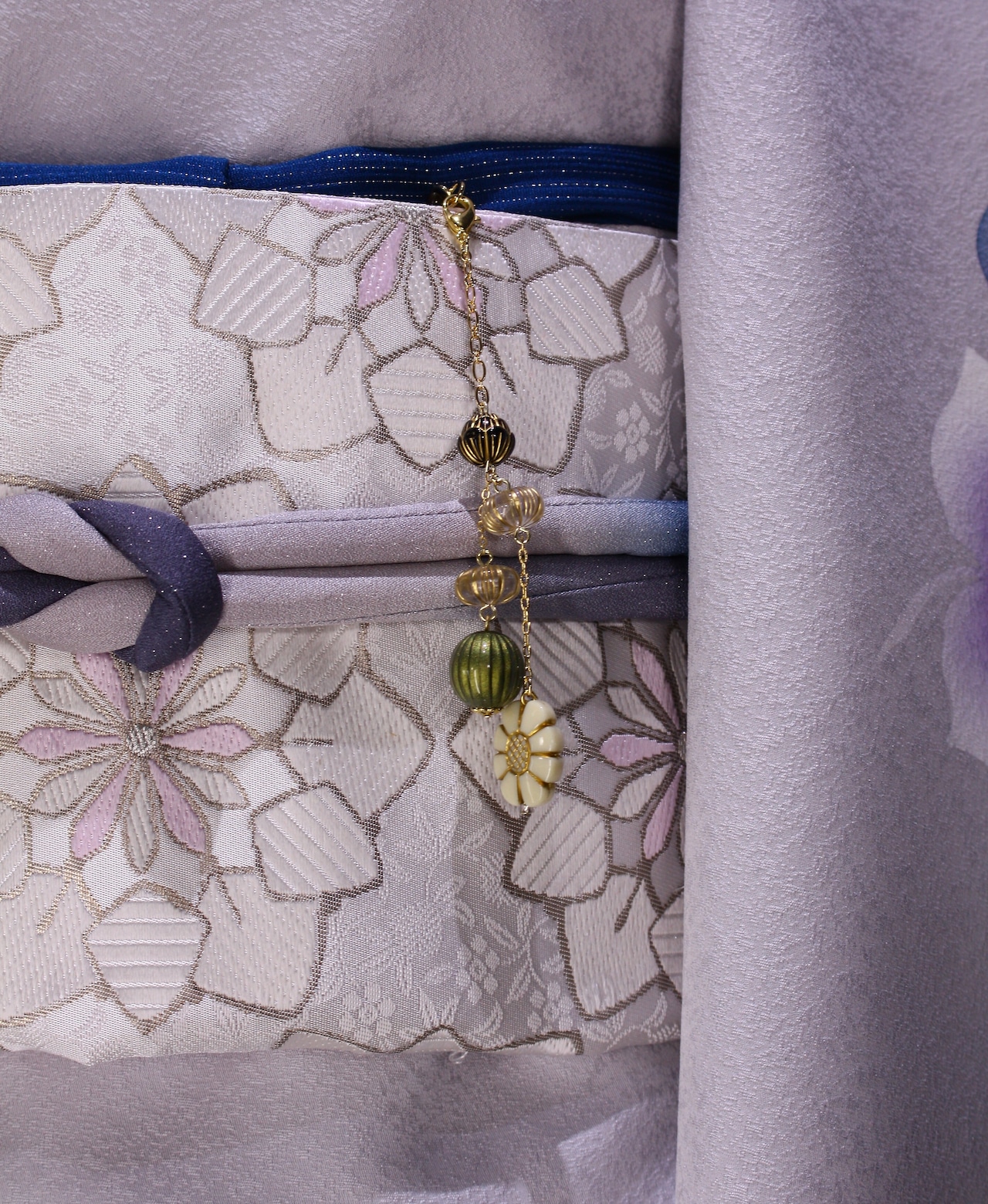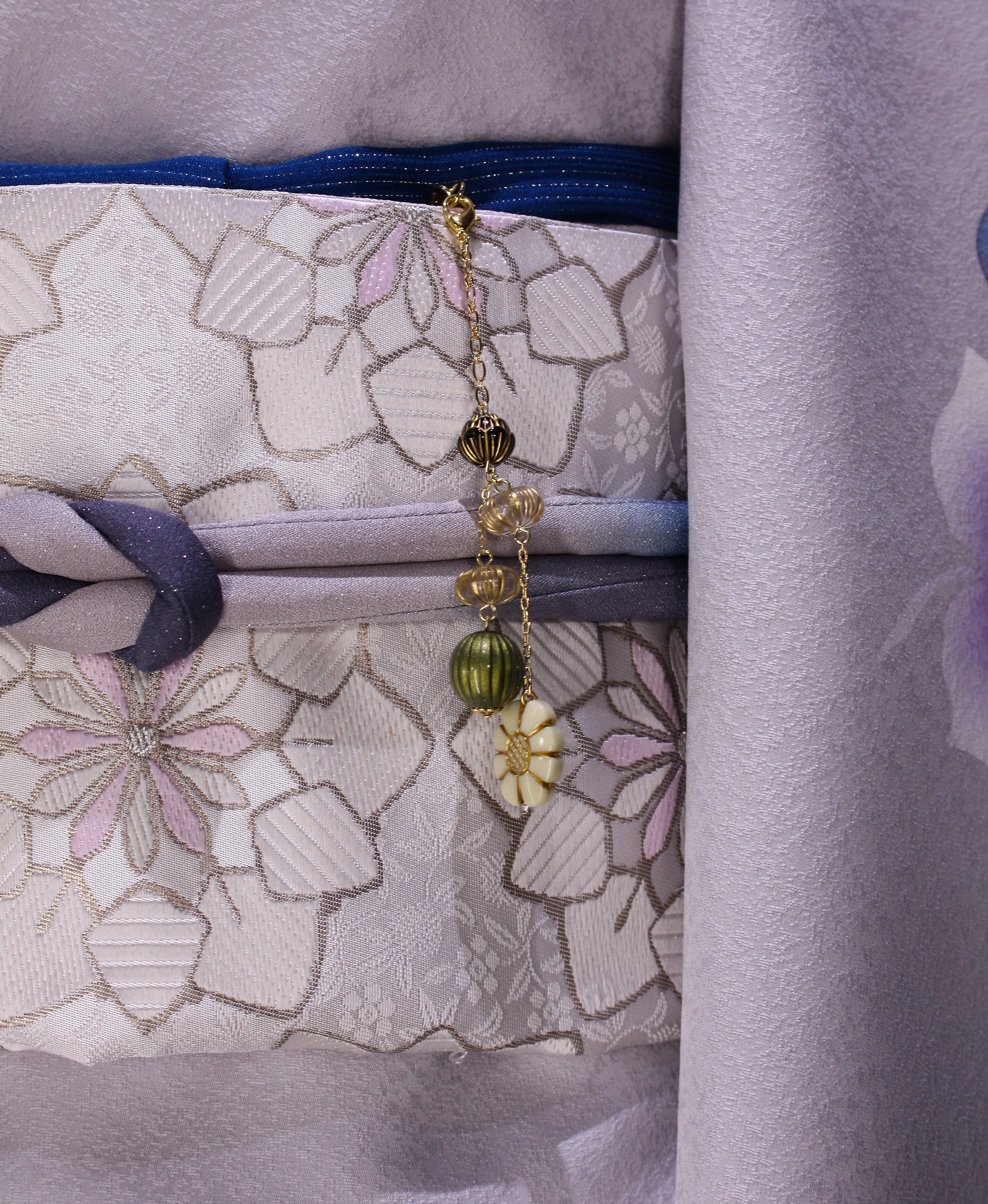 アクリルやガラスでできたビーズで作った、着物用の根付です。