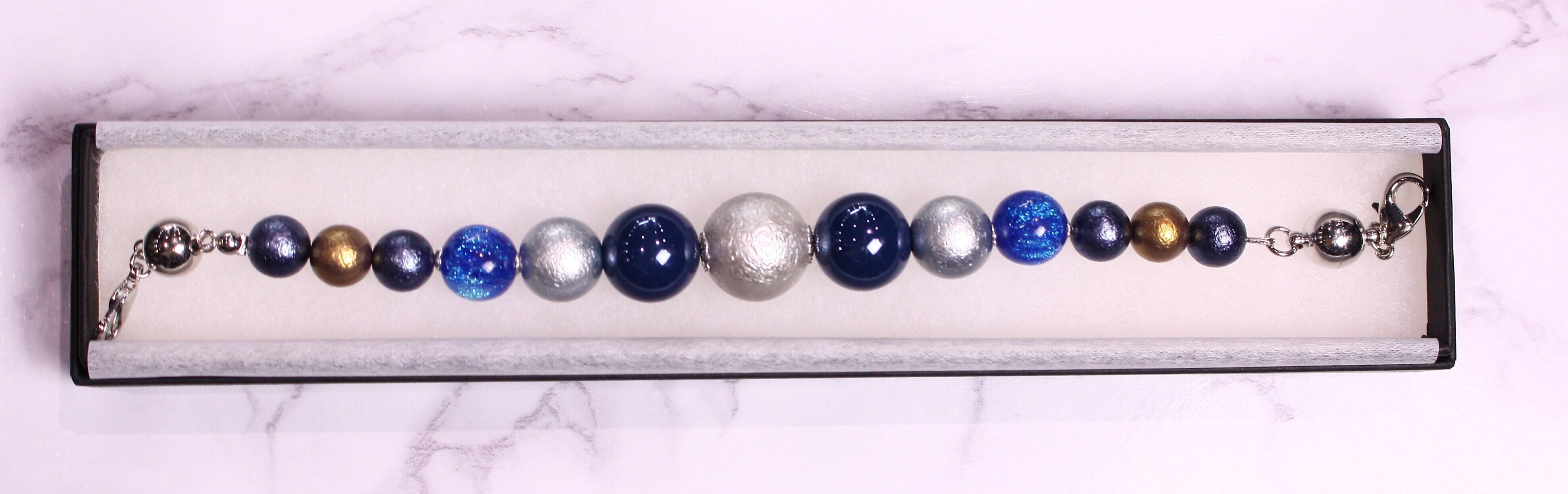 パールビーズに差し色としてブルーのガラスビーズを合わせて、上品に仕上げました。