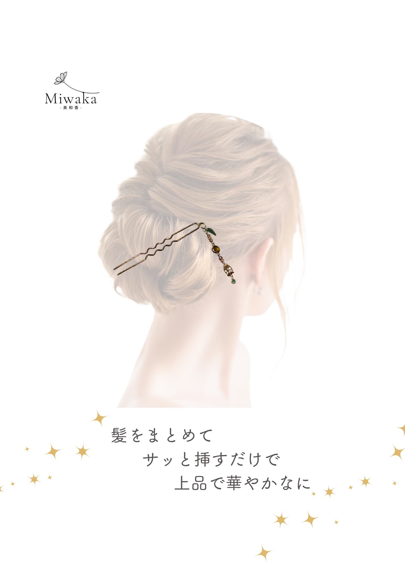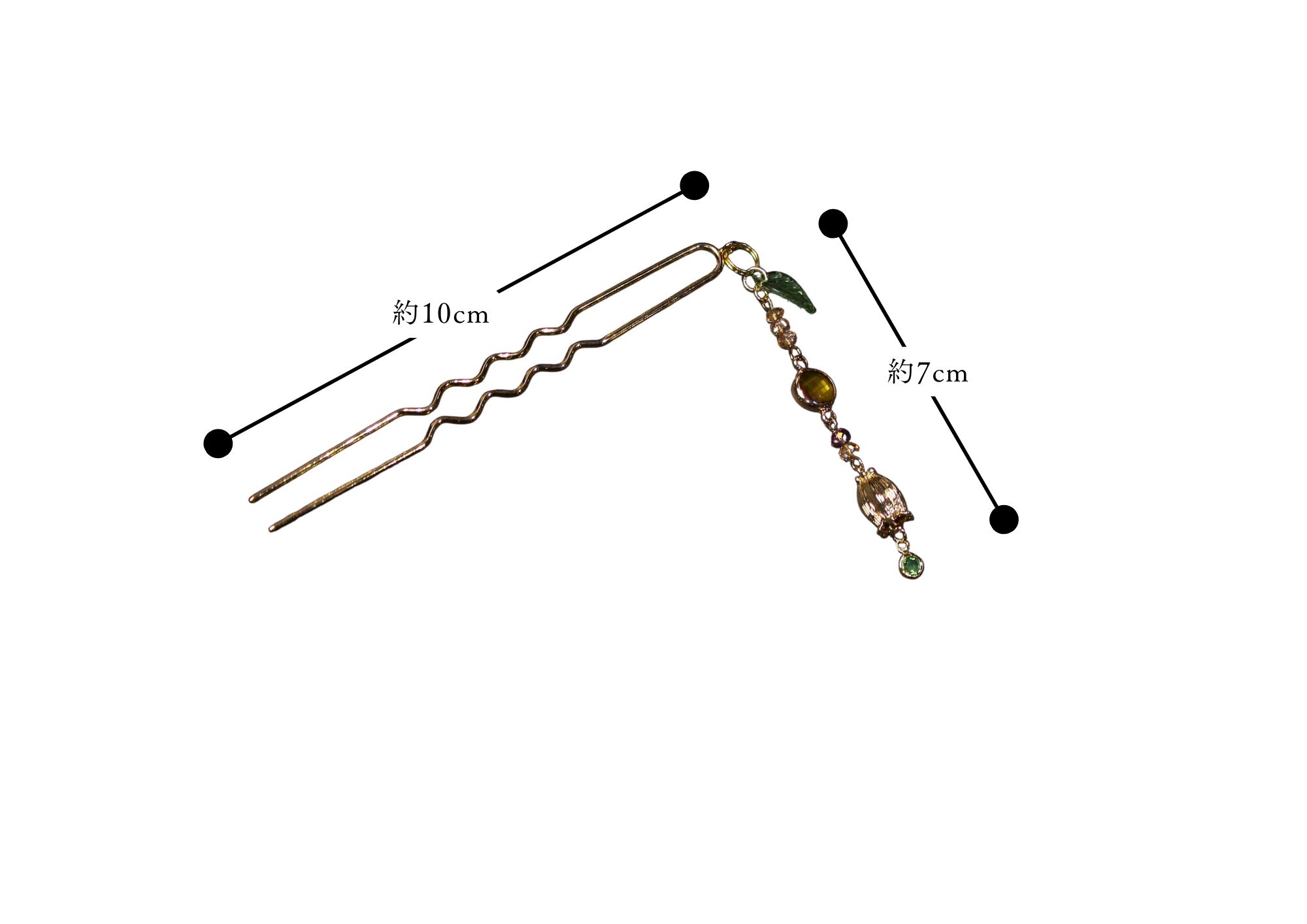 ゴールドの鈴蘭パーツにグリーンやイエローのガラスビーズを使用して華やかな雰囲気に仕上げました。